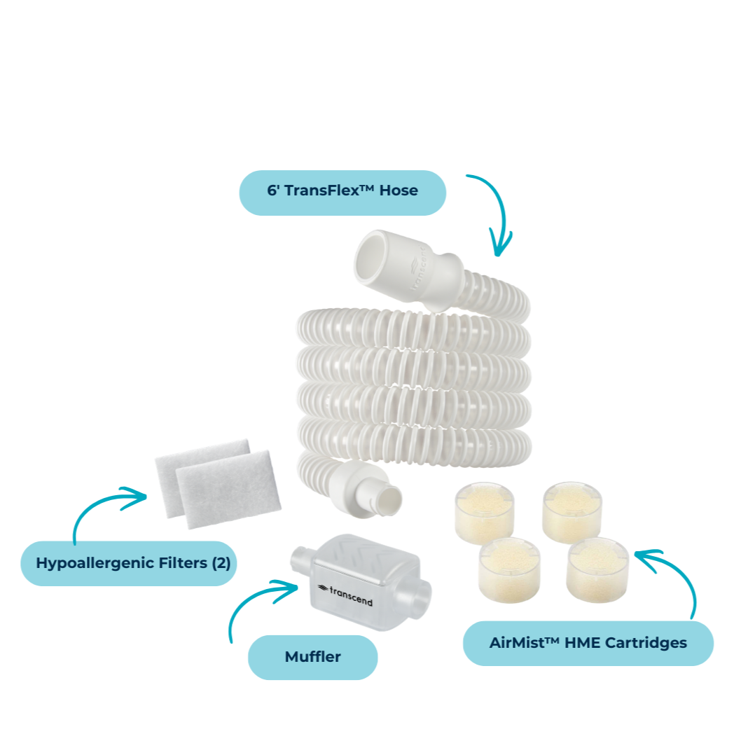 This all-in-one pack includes a 6-foot TransFlex™ Hose, an AirMist™ HME Adapter, four AirMist™ HME Cartridges, and a pack of two hypoallergenic filters.
