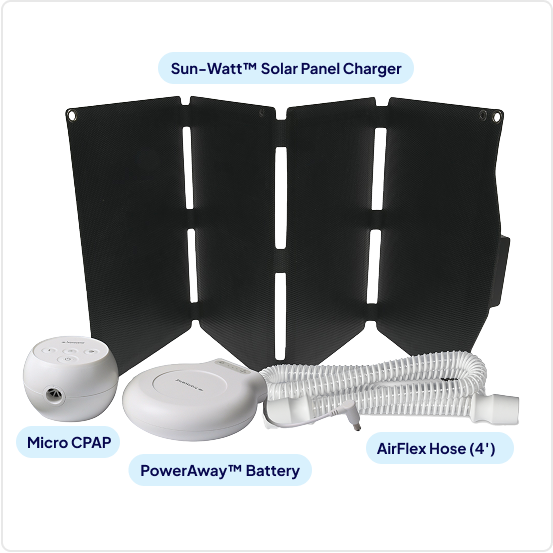 Explore remote destinations, camp for weeks, or live the RV life without ever worrying about finding a power outlet. This exclusive bundle is built for true adventurers, pairing the Transcend Micro™ Auto CPAP with the PowerAway™ Battery and the rugged Sun-Watt™ Solar Panel.